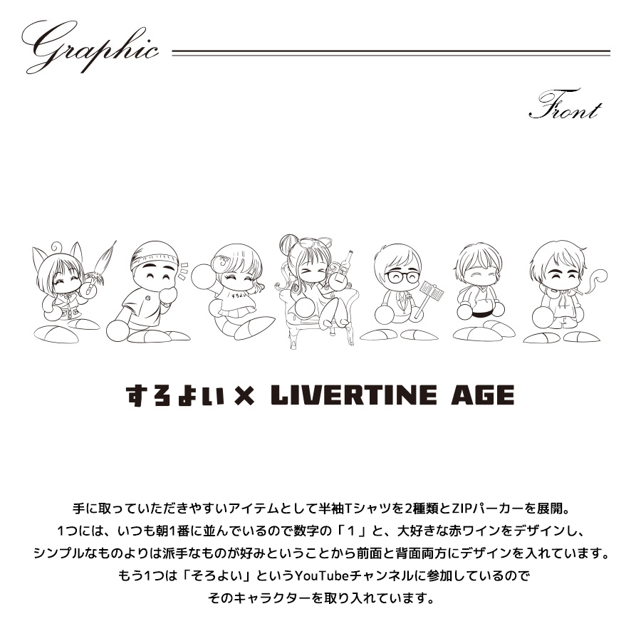 | 商品Data | Emimiさんとのコラボ企画! 今回のコラボは半袖TシャツTYPE-A、半袖TシャツTYPE-B、ZIPパーカーをリリース。 【デザイン】 手に取っていただきやすいアイテムとして半袖Tシャツを2種類とZIPパーカーを展開。 1つには、いつも朝1番に並んでいるので数字の「1」と、大好きな赤ワインをデザインし、 シンプルなものよりは派手なものが好みということから前面と背面両方にデザインを入れています。 もう1つは「そろよい」というYouTubeチャンネルに参加しているのでそのキャラクターを取り入れています。 ここでしか手に入らない受注期間限定アイテムです!是非お買い求めください!!! ※商品の発送予定時期は【5月下旬頃~6月上旬頃順次発送】 となります。 ※受注生産の為、発送予定時期が前後する場合がございます。 ※高額注文の場合には ご注文後にお電話にてご連絡をさせていただく場合がございます。 お電話にてご連絡が取れない場合にはメールにてご連絡させていただき、 ご連絡日より3日以内にご返信をいただけない場合には不正注文の可能性があると判断し トラブル防止のためご注文をキャンセルとさせていただきます。 ※商品によっては撮影時にサンプルを使用しているため若干仕様が異なる場合がございます。 また、サイズ・カラーによっては仕様が異なる場合もございます。 ※手作業で縫製をしているため縫製の仕様により、 個体差が生じてしまいますので、1~2cm程度の誤差は予めご了承くださいませ。 ※洗濯機を使用した場合、お届け時のサイズより多少縮む場合がございます。 洗濯機を使用する場合は裏返してネットに入れることを推奨しております。 また、タンブラー乾燥機を使用しますとプリントが剥がれる恐れがありますので 避けていただきますようお願いいたします。 また、洗濯時の液温は40度以下とし、 塩素系および酸素系漂白剤の使用は避けていただきますようお願いいたします。 アイロンにつきましてもプリント及び刺繍部分は避け、 生地部分にアイロンをかける場合にはあて布をして110度(低温)にてお願いいたします。 ※また、受注生産とさせていただいておりますが、 各色・サイズ毎に生産数に限りがございます為、 生産数の上限に達しました場合在庫切れとなる場合がございます。 |