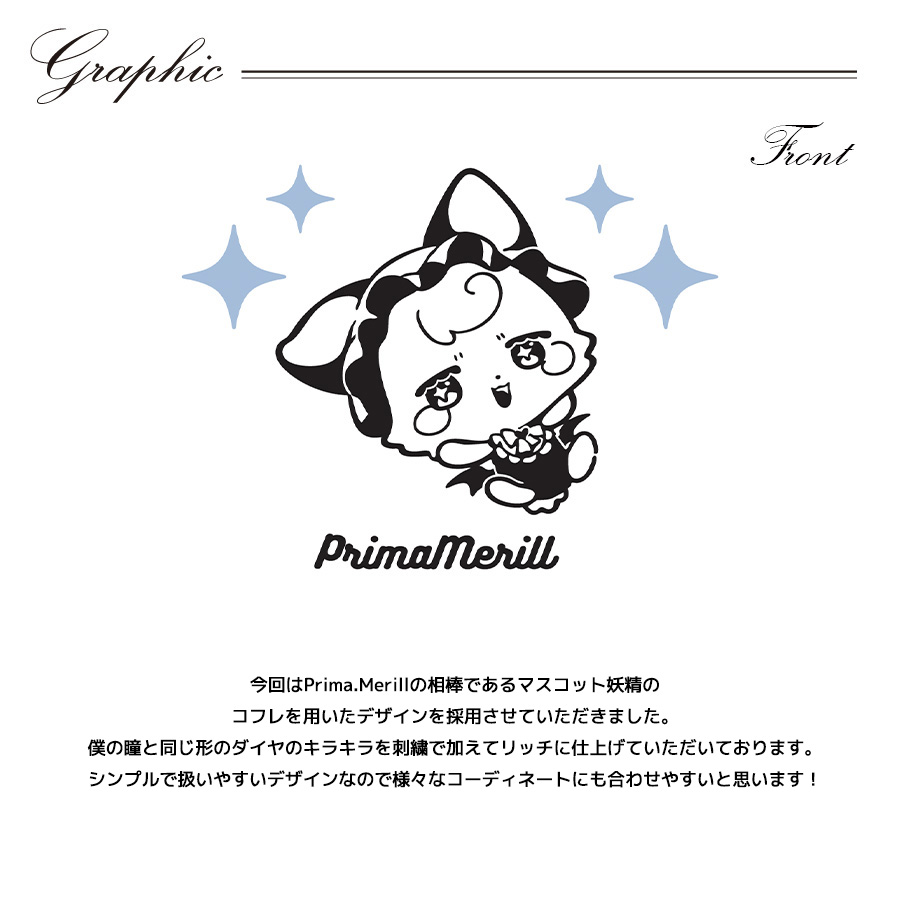 | 商品Data | Prima.Merillさんとのコラボ企画! 今回のコラボは半袖Tシャツ、トレーナー、トートバッグをリリース。 【デザイン】 今回はPrima.Merillの相棒である マスコット妖精のコフレを用いたデザインを採用させていただきました。 僕の瞳と同じ形のダイヤのキラキラを刺繍で加えてリッチに仕上げていただいております。 シンプルで扱いやすいデザインなので様々なコーディネートにも合わせやすいと思います! ここでしか手に入らない受注期間限定アイテムです!是非お買い求めください!!! ※商品の発送予定時期は【7月中旬頃~7月下旬頃順次発送予定】 となります。 ※受注生産の為、発送予定時期が前後する場合がございます。 ※高額注文の場合には ご注文後にお電話にてご連絡をさせていただく場合がございます。 お電話にてご連絡が取れない場合にはメールにてご連絡させていただき、 ご連絡日より3日以内にご返信をいただけない場合には不正注文の可能性があると判断し トラブル防止のためご注文をキャンセルとさせていただきます。 ※商品によっては撮影時にサンプルを使用しているため若干仕様が異なる場合がございます。 また、サイズ・カラーによっては仕様が異なる場合もございます。 ※手作業で縫製をしているため縫製の仕様により、 個体差が生じてしまいますので、1~2cm程度の誤差は予めご了承くださいませ。 ※洗濯機を使用した場合、お届け時のサイズより多少縮む場合がございます。 洗濯機を使用する場合は裏返してネットに入れることを推奨しております。 また、タンブラー乾燥機を使用しますとプリントが剥がれる恐れがありますので 避けていただきますようお願いいたします。 また、洗濯時の液温は40度以下とし、 塩素系および酸素系漂白剤の使用は避けていただきますようお願いいたします。 アイロンにつきましてもプリント及び刺繍部分は避け、 生地部分にアイロンをかける場合にはあて布をして110度(低温)にてお願いいたします。 ※また、受注生産とさせていただいておりますが、 各色・サイズ毎に生産数に限りがございます為、 生産数の上限に達しました場合在庫切れとなる場合がございます。 |