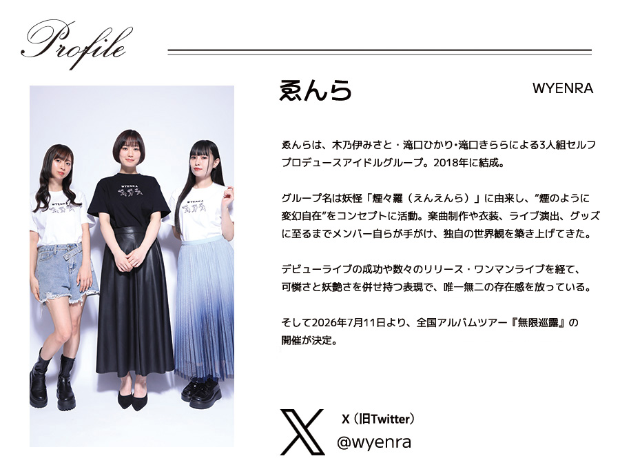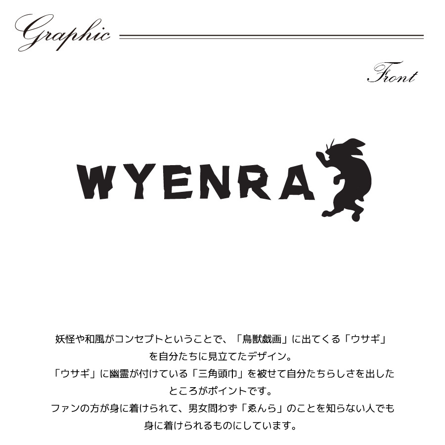| 商品Data | ゑんらさんとのコラボ企画! 今回のコラボは半袖Tシャツ、キャップをリリース。 ※メンズモデル着用画像はコンポジットイメージとなります。 【デザイン】 妖怪や和風がコンセプトということで、「鳥獣戯画」に出てくる「ウサギ」を自分たちに 見立てたデザイン。 「ウサギ」に幽霊が付けている「三角頭巾」を被せて自分たちらしさを出したところがポイントです。 ファンの方が身に着けられて、男女問わず「ゑんら」のことを知らない人でも身に着けられるものに しています。 ここでしか手に入らない受注期間限定アイテムです!是非お買い求めください!!!