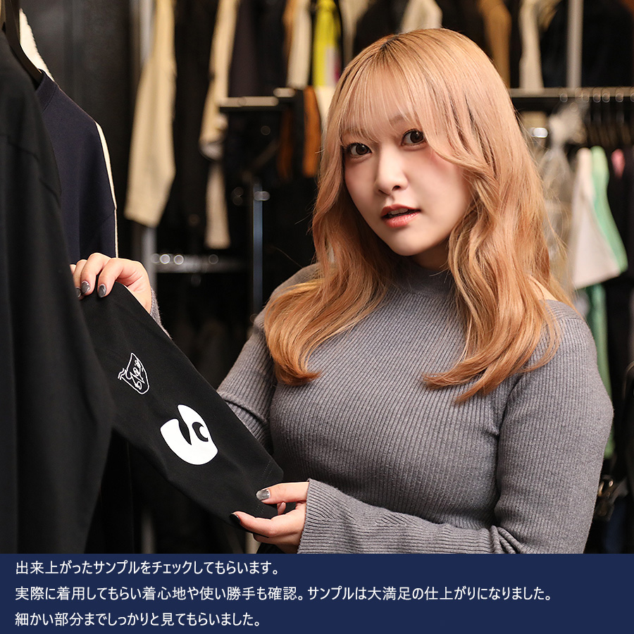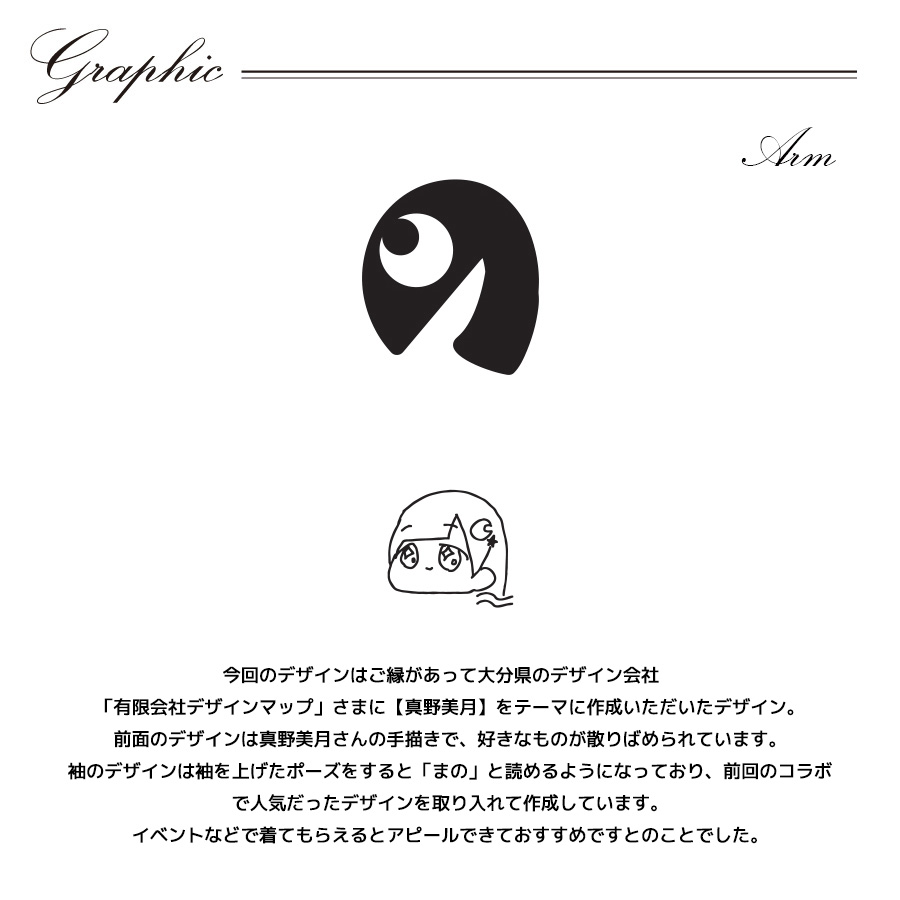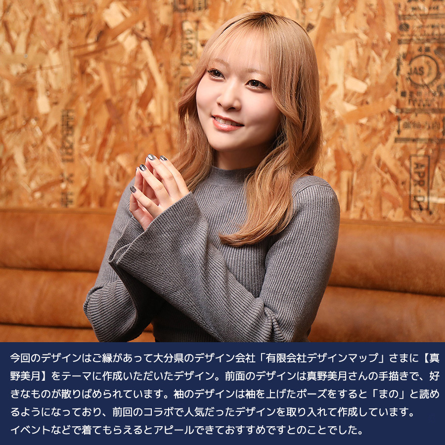 | 商品Data | 真野美月さんとのコラボ企画第4弾! 今回のコラボは長袖Tシャツをリリース。 【デザイン】 今回のデザインはご縁があって大分県のデザイン会社 「有限会社デザインマップ」さまに【真野美月】をテーマに作成いただいたデザイン。 前面のデザインは真野美月さんの手描きで、好きなものが散りばめられています。 袖のデザインは袖を上げたポーズをすると「まの」と読めるようになっており、前回の コラボで人気だったデザインを取り入れて作成しています。 イベントなどで着てもらえるとアピールできておすすめですとのことでした。 ここでしか手に入らない受注期間限定アイテムです!是非お買い求めください!!! ※商品の発送予定時期は【7月中旬頃~7月下旬頃順次発送予定】 となります。 ※受注生産の為、発送予定時期が前後する場合がございます。 ※高額注文の場合には ご注文後にお電話にてご連絡をさせていただく場合がございます。 お電話にてご連絡が取れない場合にはメールにてご連絡させていただき、 ご連絡日より3日以内にご返信をいただけない場合には不正注文の可能性があると判断し トラブル防止のためご注文をキャンセルとさせていただきます。 ※商品によっては撮影時にサンプルを使用しているため若干仕様が異なる場合がございます。 また、サイズ・カラーによっては仕様が異なる場合もございます。 ※手作業で縫製をしているため縫製の仕様により、 個体差が生じてしまいますので、1~2cm程度の誤差は予めご了承くださいませ。 ※洗濯機を使用した場合、お届け時のサイズより多少縮む場合がございます。 洗濯機を使用する場合は裏返してネットに入れることを推奨しております。 また、タンブラー乾燥機を使用しますとプリントが剥がれる恐れがありますので 避けていただきますようお願いいたします。 また、洗濯時の液温は40度以下とし、 塩素系および酸素系漂白剤の使用は避けていただきますようお願いいたします。 アイロンにつきましてもプリント及び刺繍部分は避け、 生地部分にアイロンをかける場合にはあて布をして110度(低温)にてお願いいたします。 ※また、受注生産とさせていただいておりますが、 各色・サイズ毎に生産数に限りがございます為、 生産数の上限に達しました場合在庫切れとなる場合がございます。 |