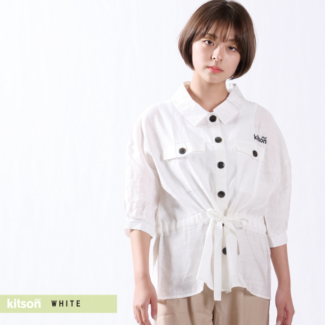 | 商品Data | Kitsonmeのオリジナルロゴデザイン刺繍。 大きめなボタンがデザインポイント。 ウエストのリボンを締めるとメリハリのあるスタイルに◎ |
